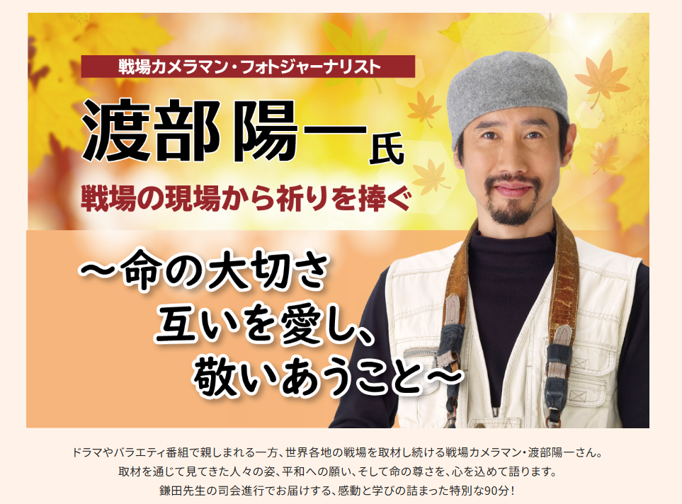 2025年10月12日 18:02 コメント 0 件 渡部陽一氏特別講演こんばんは(^o^)丿 11月のオンラインカルチャーは 戦場カメラマン 渡部陽一氏の特別講演です。 ライブ講演会が 11月19日(水)13:30~15:00 録画映像上映会が 11月22日(土)10:30~12:00 11月25日(火)13:30~15:00 です。 この方がすごいなと思うのは 生徒さんの誰もが 知っていた事です。 ここ何年かはテレビで 見かけませんが ある時期にすごくテレビに 出ておられたんでしょうね。 戦場カメラマンという肩書きも インパクトがあったのだと思います。 渡部陽一氏の話し方は 子供の頃からゆっくりだったそうですが 戦場カメラマンとして 言葉が通じない人々にも理解してもらうために 意図的にゆっくりと丁寧に言葉を 伝えるようになったそうです。 自宅からも参加できますので ぜひご参加くださいね! まだまだ予約受付中です 小松