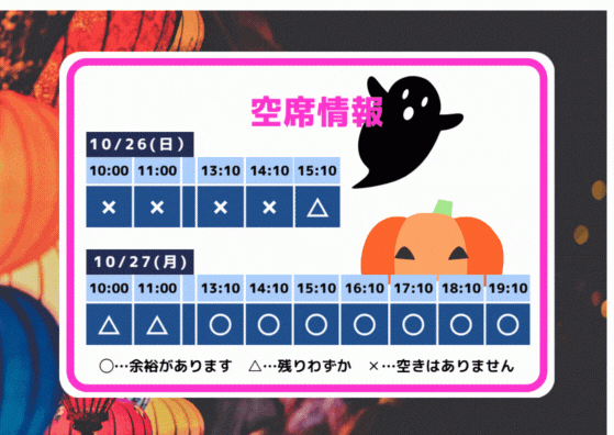 2025年10月26日 13:43 コメント 0 件 空席情報10/27(月)10/28(火)の空席情報をお知らせします