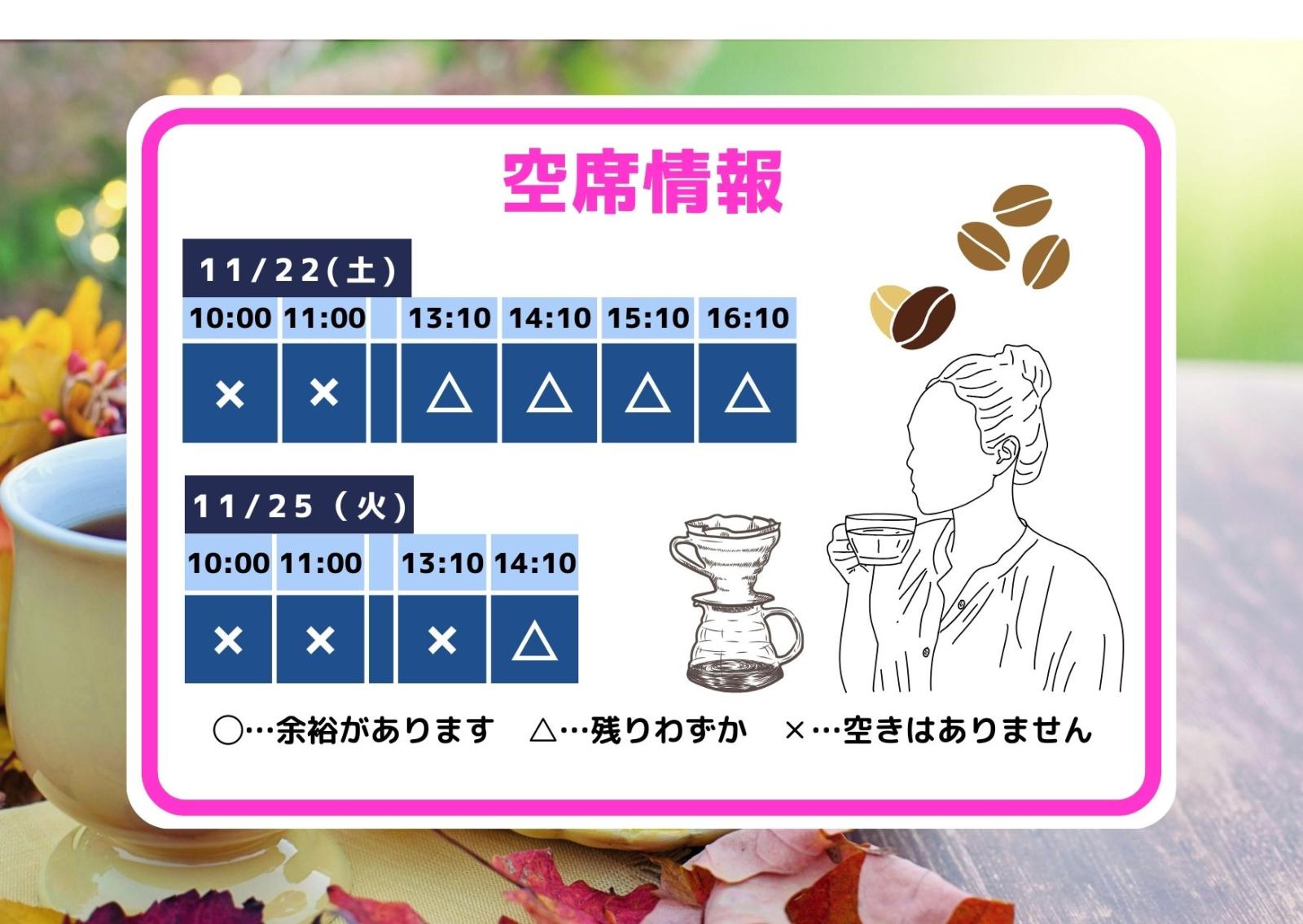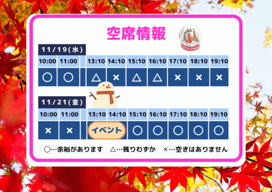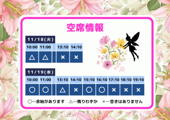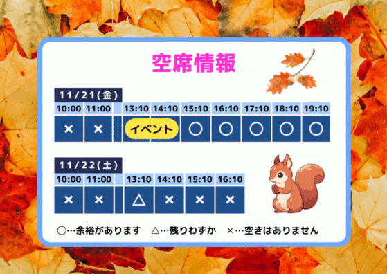 2025年11月19日 17:05 コメント 0 件 空席情報11/21(金)11/22(土)の空席情報をお知らせします。