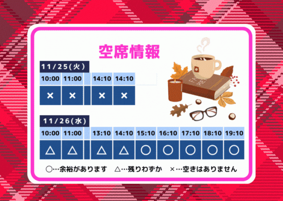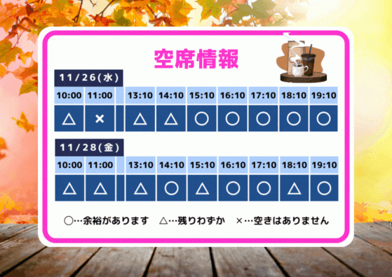 2025年11月25日 14:25 コメント 0 件 空席情報11/26(水)11/28(金)の空席情報をお知らせします。