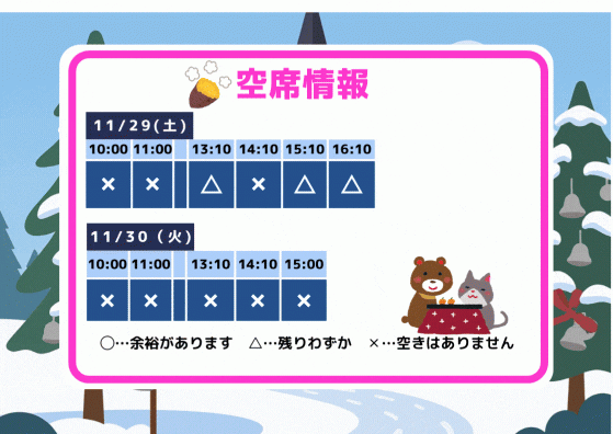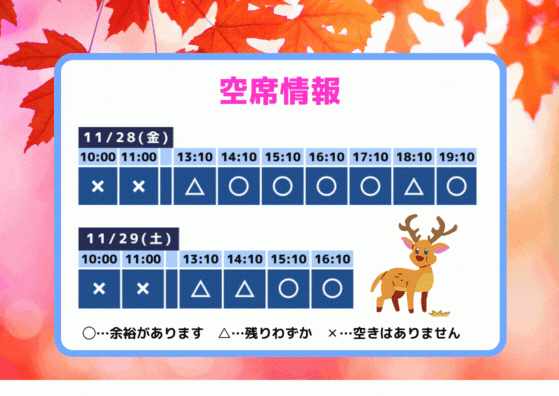 2025年11月28日 18:34 コメント 0 件 空席情報11/29(土)11/30(日)の空席情報をお知らせします
