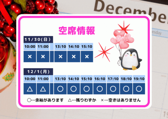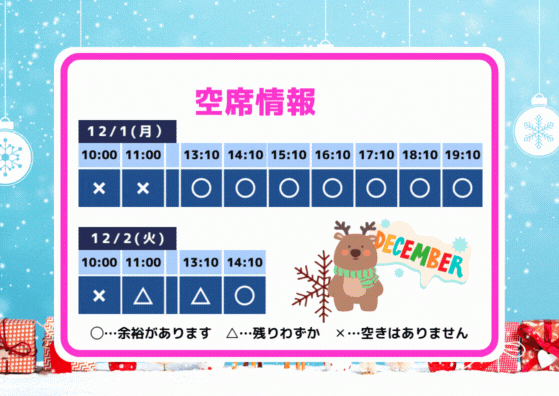 2025年11月30日 16:50 コメント 0 件 空席情報12/1(月)12/2(火)の空席情報をお知らせします