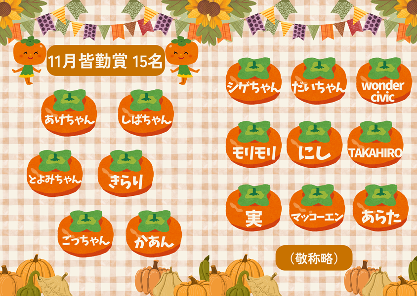 2025年12月01日 12:09 コメント 4 件 11月プレミアログインこんにちは(^o^)丿 今日から12月ですね 来月の今日は元旦だと思いました。 11月のプレミアログイン結果を 発表しますね。 今回もCanvaで作成しました。 10月の皆勤賞と色合いが 似てしまったかな 11月は紅葉かなと思ったのですが 今年は熊のニュースが多く 木に登って柿を食べている映像を たくさん見たせいか 柿にしようと思いました。 10月がカボチャで 11月が柿になりました 最近、入会された方も ログイン頑張ってくださり プレミアサイトのタイピング練習も されてる方もおられます。 パソコンを開くきっかけになって 嬉しいです。 パソコン初心者の方は とにかくたくさんパソコンに触ることが 上達する近道ですね 小松