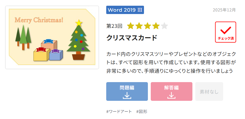2025年12月04日 12:40 コメント 2 件 12月チャレンジ課題 Word編こんにちは(^o^)丿 12月のチャレンジ課題 ワードのご紹介です 今月は 図形でクリスマスカードを はがきサイズで作成します。 チャレンジレベルが ☆5つ中4つの上級レベル になっています。 実際に作成してみて 確かに上級レベルかもと 思いました。 こだわる人には大変かもです。 私も、こだわる人なので まずクリスマスツリーのところで 三角形を4つ合わせるのですが 下にいくほど幅を広くしたり バランスを気にしだすと けっこう大変です。 へえ~!っと思ったのが グループ化した クリスマスツリーや木に 影をつけるんですね。 それだけで味がでるというか 深みがでます。 ちょっと完成見本と 色を変えたり フォントの種類を変えてみました。 色の指定はありますが 自分の好きな色で作成する方が 楽しいと思います♪ 細かい作業の所は ワードの画面を大きくしてくださいね。 小松