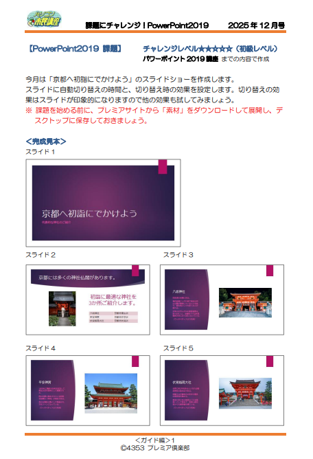 2025年12月07日 21:35 コメント 5 件 12月チャレンジ課題PowerPointこんばんは(^o^)丿 今月のチャレンジ課題 パワーポイントのご紹介です 「京都へ初詣にでかけよう」 というタイトルで合計5枚のスライドを 作成します。 神社の説明の入力が多いので タイピング練習にもなりました。 今回はパワーポイントらしい 操作も多いです。 スライドショーを始める時は 何も設定しなければ 画面上をクリックやEnterキーで スライドを切り替えていきますが 画面切替が自動でされるように 設定します。 今回は3秒で切り替わるようにします。 読む人の気持ちになると 3秒で切り替わると 神社の説明が全部読めないなと思いました。 内容によって秒数を長くしたり 調整が必要ですね。 チャレンジ課題は ここまでで終了していますが 最後に動画として保存すると SNSにアップする事もできますね(*^-^*) 小松