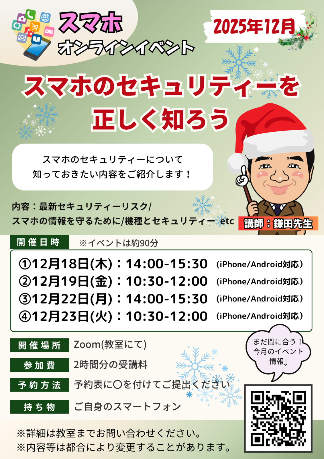 2025年12月01日 20:20 コメント 2 件 かまた先生のスマホオンラインイベントこんばんは。パソコン市民講座 バロー豊橋教室です。 かまた先生のスマホオンラインイベントのご案内です。 月ごとにテーマが変わります。 ぜひ毎月ご参加ください♪ 教室からのご参加になりますので、 オンラインが不安な方にも安心してご参加いただけます。 ・-・-・-・-・-・-・-・-・-・-・-・-・-・-・-・-・-・-・-・-・-・-・-・ 12月テーマ:「スマホのセキュリティーを正しく知ろう」 12/18(木)14:00-15:30(iPhone/Android対応) 12/19(金)10:30-12:00(iPhone/Android対応) 12/22(月)14:00-15:30(iPhone/Android対応) 12/23(火)10:30-12:00(iPhone/Android対応) 1月テーマ:「最新のスマホ事情を理解しよう(2026年版)」 1/26(月)14:00-15:30(iPhone/Android対応) 1/28(水)10:30-12:00(iPhone/Android対応) 1/29(木)14:00-15:30(iPhone/Android対応) 1/30(金)10:30-12:00(iPhone/Android対応) ・-・-・-・-・-・-・-・-・-・-・-・-・-・-・-・-・-・-・-・-・-・-・-・ なお、午後のイベントの開始時間は14時~です。 よろしくお願いします。 また、見逃し配信もスタートしています。 全てのラインナップが受講できるのは1月までです。 ぜひこの機会をお見逃しなく! どちらもご予約お待ちしています。