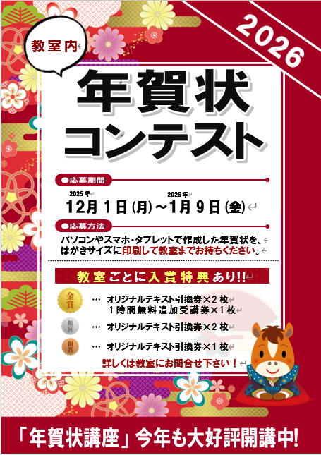 2025年12月03日 15:02 コメント 1 件 年賀状大募集!こんにちは。 パソコン市民講座バロー豊橋教室です。 教室では年賀状コンテストを開催中! ワードやCanvaや筆ぐるめで作成した年賀状を教室に掲示しています。 まだの方は、次に教室にいらしたときは、ぜひ作成してくださいね♪ 作成したものは、教室に掲示させていただくほか、かんたんSNSにも投稿してもらっています。 わからない方はインストラクターに聞いてください。 一緒に投稿をお手伝いします! 次の教室での年賀状イベントは 「スマホで年賀状をつくろう」 12月10日(木)13:20~ となっています。 スマホの写真を使って、簡単に素敵な年賀状が出来上がります。 出来上がったものは、LINEなどでお友達に簡単に送れますよ♪ チャレンジしてみませんか? 皆様のご予約をお待ちしています!