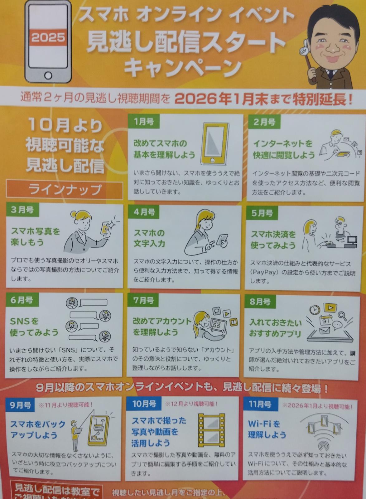 2025年12月05日 20:50 コメント 1 件 とってもおススメ見逃し配信!こんばんは 豊橋教室のブログへようこそ! 今日は、とってもおすすめをご紹介。 スマホオンラインイベントって、ご存じですよね? かまた先生が、毎月生配信でスマホの色々を教えてくれる、人気のオンラインイベントです。 10月から、見逃し配信が出来るようになりました。 豊橋教室では、生配信の時間の予約は、よく満員になる大人気イベント。 生配信なので、時間が限られていて、夕方や夜の受講の時間帯の方には なかなか参加して頂けないイベントとなっております。 そのイベントが見逃し配信できるようになりました。 1月末の間は、今年の1月の配信から今なら10月の配信までどれでもご覧いただけます。 視聴方法は、教室に予約をいただく際に、「見逃し配信の○○月が見たいです」 と、先生に伝えていただければ、夜の時間台でも2時間受講が可能ならば、 視聴していただけます。 参加費は、2時間分の料金で大丈夫。 イベント参加パスポートも、無料券も使っていただけます。 画僧を見て、気になるテーマがあったら、必ず視聴して見て下さい。 きっと、あなたのスキルアップに役立ちます。 詳しくは、教室の先生まで。