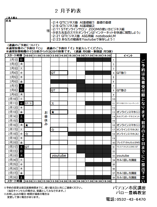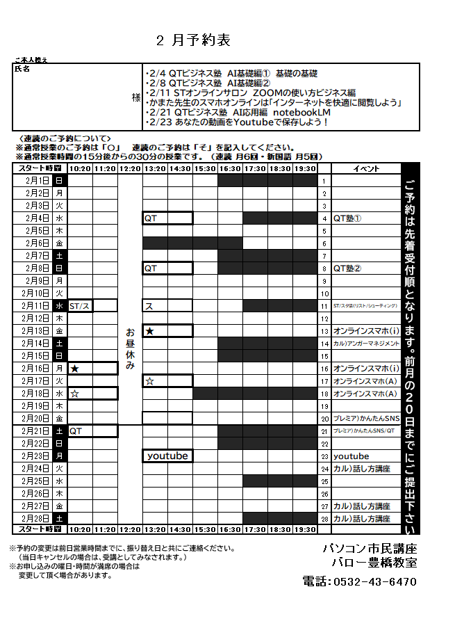 こんにちは 豊橋教室のブログへようこそ! 本日から教室は通常営業です。 教室では、新年早々2月の予約表の配布もスタートしました。 2月の予約は明日、5日からスタートします。 2月もイベント満載の月となります。 オンラインイベントが4回ほどあります。 3回は、QTビジネス塾でAIについての基礎から応用まで開催です。 残りの一回は、STオンラインサロンでZOOMビジネス編を1時間で開催します。 日ごろZOOMを利用しているビジネス層の皆さん。 もちろんビジネス活用出ない方もいいのですが、 いつものSTオンラインサロンの内容よりも、内容がビジネスよりの内容となっております。 今月から、お楽しみ交流編とZOOM活用編と交互に展開予定です。 あなたのまだ知らない世界がZOOMの中にもあります。 ぜひ、2月11日10:20-11:20の1時間 オンラインを繋いで学んでみましょう!