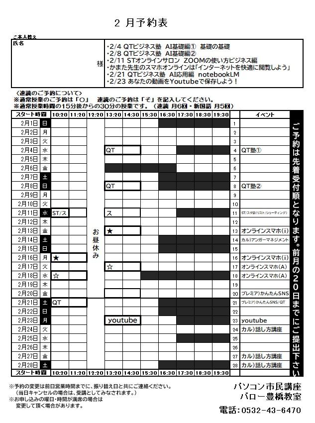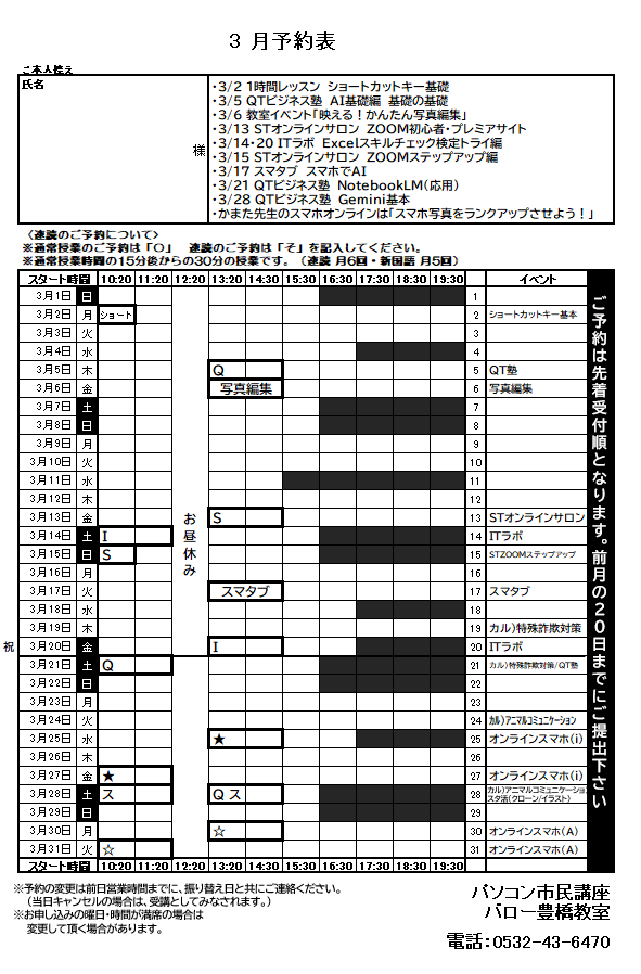 こんにちは。パソコン市民講座 バロー豊橋教室です。 明日から3月のご予約受付を開始します。 受講の際に順次、予約表をお渡ししていきますね。 3月もイベント盛りだくさんです! ご予約お待ちしています!