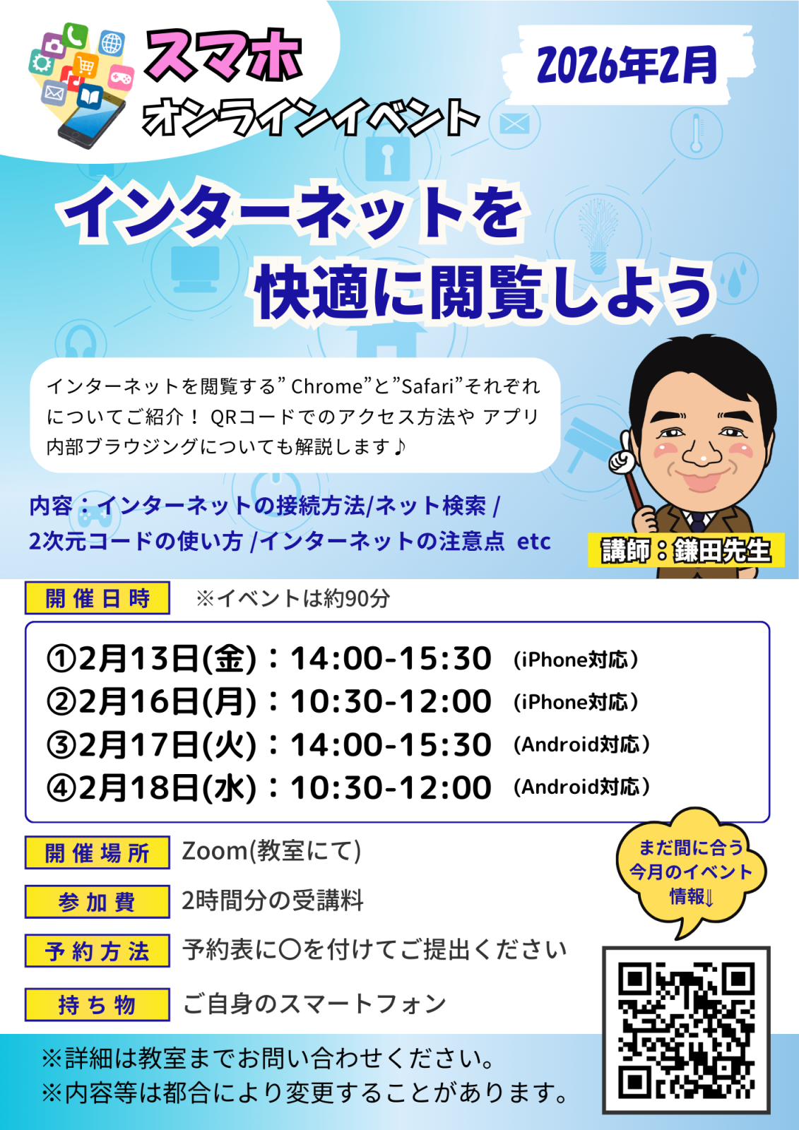 2026年02月08日 16:30 コメント 1 件 かまた先生のスマホオンラインイベントこんばんは。パソコン市民講座 バロー豊橋教室です。 かまた先生のスマホオンラインイベントのご案内です。 月ごとにテーマが変わります。 ぜひ毎月ご参加ください♪ 教室からのご参加になりますので、 オンラインが不安な方にも安心してご参加いただけます。 ・-・-・-・-・-・-・-・-・-・-・-・-・-・-・-・-・-・-・-・-・-・-・-・ ◎ スマホオンラインイベント ライブ配信日程 2月テーマ:「インターネットを快適に閲覧しよう」 2/13(金)14:00-15:30(iPhone対応) 2/16(月)10:30-12:00(iPhone対応) 2/17(火)14:00-15:30(Android対応) 2/18(水)10:30-12:00(Android対応) 3月テーマ:「スマホ写真をランクアップさせよう 」 3/25(水)14:00-15:30(iPhone対応) 3/27(金)10:30-12:00(iPhone対応) 3/30(月)14:00-15:30(Android対応) 3/31(火)10:30-12:00(Android対応) ・-・-・-・-・-・-・-・-・-・-・-・-・-・-・-・-・-・-・-・-・-・-・-・ なお、午後のイベントの開始時間は14時~です。 よろしくお願いします。 見逃し配信はライブ実施の翌々月から2か月です。 今月は11月・12月開催分の見逃し配信受講が可能です。 どちらもご予約お待ちしています。 ・-・-・-・-・-・-・-・-・-・-・-・-・-・-・-・-・-・-・-・-・-・-・-・ ◎ 今月の受講可能見逃し配信 11月テーマ:「Wi-Fiを理解しよう」 12月テーマ:「スマホのセキュリティーを正しく知ろう」 ・-・-・-・-・-・-・-・-・-・-・-・-・-・-・-・-・-・-・-・-・-・-・-・