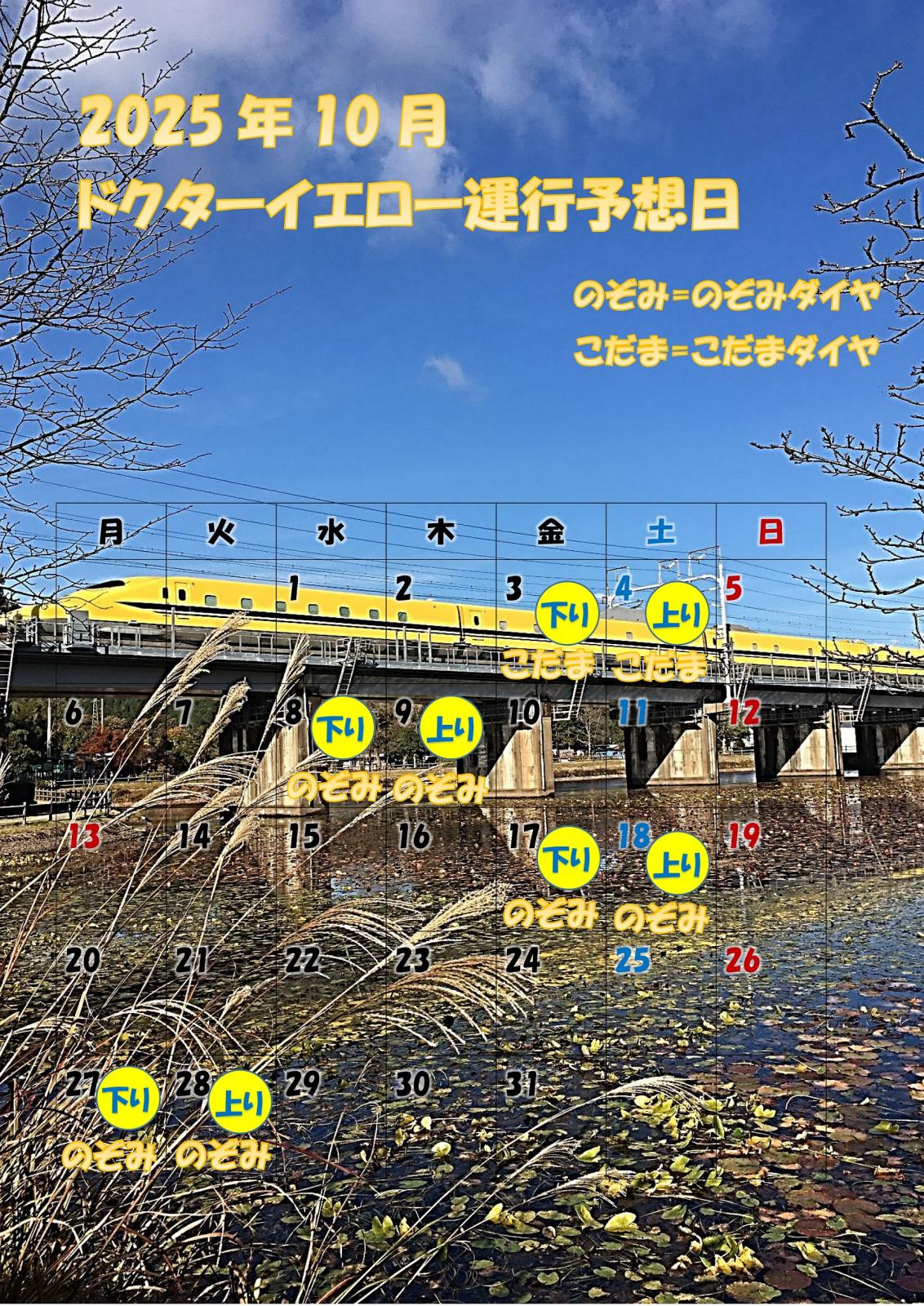 2025年10月01日 23:29 コメント 8 件 10月の黄色先生の予定はこんな感じデス♪昨日(9/29)、おとといと(9/30)と9月最後のドクターイエローのぞみ検測が運行されていました。 最近撮影に出かけることができなかったので行きたかったのですが、残念ながら時間を取ることができませんでした(´;ω;`) さて今月もこの時間がやってまいりました♪ 10月のドクターイエロー運行予想日のお知らせでございます(=゚ω゚)ノ イトーヨーカドー明石教室のmasakishiさんの方から、ご自身のブログでお知らせがありましたので僕の方もいつものように表にまとめてお知らせさせていただきます。 写真左側…10月のドクターイエロー運行予想日カレンダー 写真真ん中…ドクターイエローのぞみ検測ダイヤ 写真右側…ドクターイエローこだま検測ダイヤ 今月は早速、金曜日と土曜日にこだま検測が走る予想がありますね。 また各駅ともに賑わうことでしょう。 僕が都合を付けて撮影に出かけることができるのは、たったの1日だけであります(;^ω^) その日は何とか都合を付けてでかけてみようかしらん… それでは次回のドクターイエロー運行予想日は10/3(金),10/4(土)でこだま検測でございます(=゚ω゚)ノ