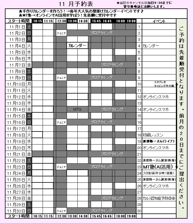 2025年09月29日 12:30 コメント 0 件 ★11月予約受付開始★こんにちは、あべの教室です。 教室からのお知らせです。 ★11月予約受付開始! 教室では11月予約表をお渡ししています。 ご予約は、電話またはメールでも受付けています。 メールの場合は、件名にフルネームのご記入をお願いいたします。 ★11月レッスン 『カレンダー作成イベント』 11月4日(火)13:30~ 毎年大人気のワードで作る壁掛けカレンダー作成イベントです。 スマホやデジカメで撮影した写真を使ってA3サイズの素敵なカレンダーを作りませんか? 教室ではインストラクター作成のサンプルを掲示していますのでご覧になってください。 『MT塾』 11/23(日)10:10~ オンラインレッスン第2弾! 今回も最新のAI活用について学びます。 新しい世界を広げてビジネスでも活用してください。 ★速読教室のみなさんへ 11月はスピードマスターズの教室対抗戦を開催いたします。 入賞目指して頑張りましょう♪ みなさんのご参加をお待ちしております(^^)/