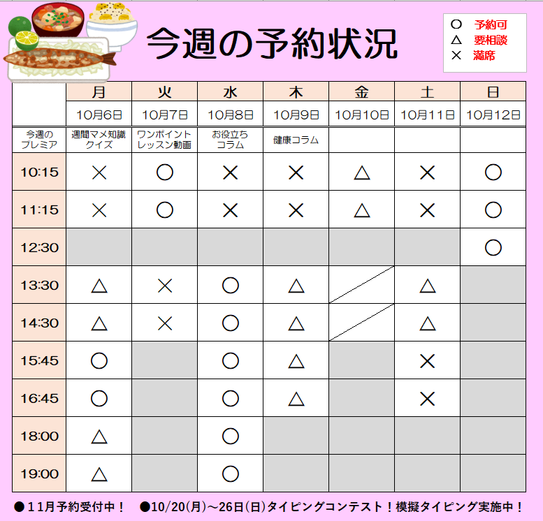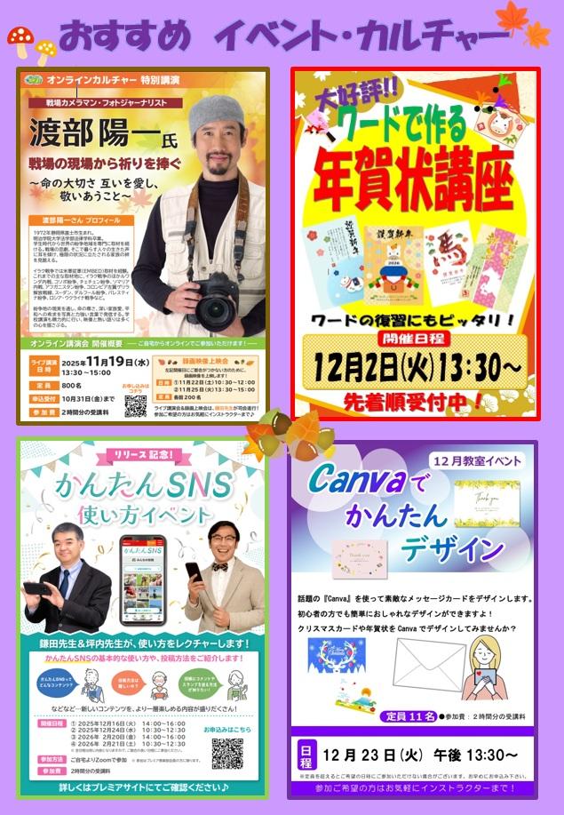 2025年10月26日 11:57 コメント 0 件 ★今週の予約状況★こんにちは、あべの教室です。 教室からのお知らせです。 ★今週の予約状況 11月2日までの予約状況をお送りします。 10月ご予約がまだの方はご予約をお願いいたします。 11月ご予約受付中! ★11月のレッスン 「カレンダーを作ろう!』 11/4(火)13:30~ 満席です。キャンセル待ち受付中! MT塾『NoteookLMを使ってみよう!』 11月23日(日)10:10~12:10 Googleが提供するノートブック形式のAIツール「NoteookLM」をご紹介! 教室参加→満席 自宅オンライン参加枠→まだまだ受付中! ★オンラインスマホ見逃し配信実施中 教室でみなさんにスマホ見逃し配信のチラシをお渡ししています。 鎌田先生のスマホ授業でスマホのスキルアップをしてみませんか? 気になる授業だけでも受講可。 教室でご相談ください。 ★速読初月無料キャンペーン実施中! みなさんに速読体験参加のアンケートをお渡ししています。 「速読ってどんなもの?」 「どんな効果があるの?」 気になる方は、まずは無料体験を! 随時受付中です(^^)/ 今週も元気なインストラクターが教室でお待ちしております(^^♪