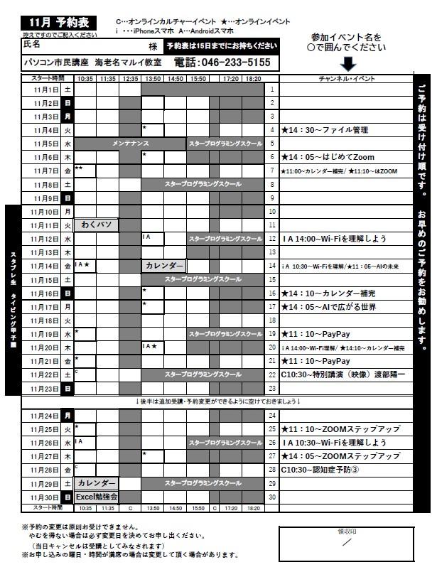 2025年10月08日 11:54 コメント 0 件 11月の予約表配布しています!!皆さまこんにちは 海老名教室の齋藤です。 教室では、もう11月の予約表をお配りしています(゚д゚)! 早いですね♪ 11月は皆さまが楽しみにしているカレンダーイベントがありますよ♪ ●オンラインカルチャー:戦争カメラマンの渡部陽一さんの講演 ●かまた先生とのオンラインスマホ:Wi-Fiを理解しよう! ●カレンダーイベント:A3サイズの壁掛けカレンダーを作りましょう♪ ●わくわくPCイベント:ファイルの大掃除! ●Excel勉強会:リストを使いこなそう!等 エリチャンではオンラインで色々な事を学べます! 興味があるものはどんどんご参加くださいね(^_-)-☆