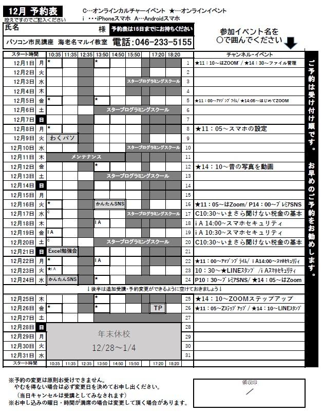 2025年11月02日 12:05 コメント 0 件 12月予約表皆さまこんにちは!(^^)! 海老名教室の齋藤です。 もう11月になりましたね。 12月の予約表をお配りしています。 お教室にいらっしゃる際はスケジュールの分かるものをお持ちくださいね♪ 【12月イベント】 ●わくわくパソコン:お正月飾りをつくろう! ●Excel勉強会:列幅に左右されない表を作ろう!他たくさん! ●かまた先生とのオンスマ ●かんたんSNSの使い方 ●エリアチャンネルも沢山ありますよ~ 年末に向けて忙しくなると思いますので パソコン教室の日にちを早めに確保しましょう! ホッと一息つける癒しの場所になるように教室も暖かく明るく準備しておきますね(*´ω`*)