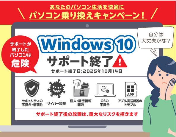 2025年10月13日 14:10 コメント 0 件 明日14日でサポート終了ですこんにちは (^^)/ みなさんついに明日でWindows10サポート終了いたします。 無料アップデートまだな方はお急ぎください。 無料アップデートの期間は明日の14日までです。 但しアップデート対象外のパソコンもございます。 ちなみに私のパソコンは対象外 ( ;∀;) 残念・・・ 買い替え必須です。 そこでこんな方の為に 市民講座より期間限定のパソコンを販売をしております。 ご興味のある方はインストラクターまでご相談ください。 教室センターテーブルにも チラシ置いていますので、ご自由にお持ち帰りいただいてOKです。
