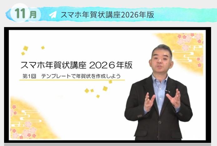 2025年11月25日 14:49 コメント 0 件 ♪スマホ年賀状講座♪皆さん こんにちは! 毎年大好評「スマホ年賀状講座2016」が始まりました。 「年賀状 2026 つむぐ年賀」というアプリを使って、かわいいイラストや 自分で撮った写真で素敵な年賀状が簡単に作れます。 年賀はがきを出すまでもないけど、ちょっとご挨拶をしたい方や 住所がわからないけれど普段からメールやLINEなどで連絡している方などに 気軽に新年のご挨拶をしてみませんか? 全2回の講座となっています。ご興味のある方はインストラクターまでお声がけ下さい。 ♪カワマタ♪