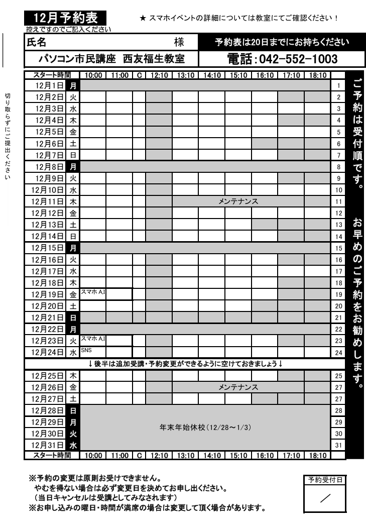 2025年11月01日 10:30 コメント 0 件 12月の予約受付開始です!!皆さまこんにちは! パソコン市民講座 西友福生教室です☆.。.:*・゜ 本日11月1日より、12月の予約受付を開始いたします。 ご予約はお電話でも承りますので、お気軽にお問い合わせください(*^^*) 12月は、パソコン・スマホで年賀状づくりを学ぶ年賀状講座がおすすめです♪ 詳細はインストラクターまでお声がけください! また、2025年は12月28日(土)まで開講しております。 12月29日(日)より年末年始休校となりますのでご了承くださいm(_ _)m これからぐっと気温も下がってきますので、体調管理にお気を付けてお過ごしください インストラクター一同