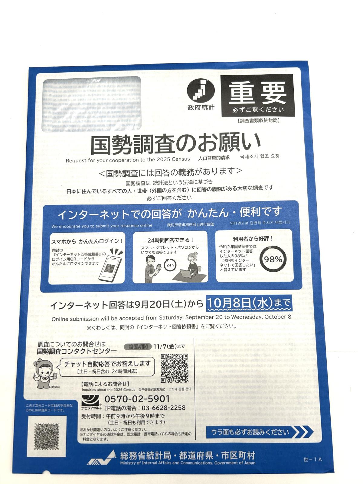 2025年09月28日 10:00 コメント 0 件 「国勢調査」をパソコンで提出しましょうみなさま、こんにちは。 本日は稲井が担当です、よろしくお願いします。(^^) や~~っと秋の空気になってきましたね。 窓を開けたときに入ってくる風が本当に気持ちいい♪ 深呼吸をしたくなります。 辛かった酷暑にさようならできるかと思うと、ホッとします。 でも、来年もまたこんな夏が来るのかと思うと、、、、 ちょっと怖くなりますけどね~~。(^_^;) --------------------------- さてさて、みなさんはもう『国勢調査』の提出はお済ですか? もしかして・・・ 同封されている用紙に記入して、ポストに投函、、、なんてことをしていませんか? この国勢調査はスマホやパソコンでできるんですよ~~。 私はスマホで登録しましたが、すごくラクチンでした。 オススメですよ。 インターネットでの回答は 9月20日(土)~10月8日(水)までです。 記入する内容は個人情報なのでお答えできないこともありますが、 操作方法などは我々がお手伝いできるかもしれません。 「一度パソコンで提出してみたい。でもやり方が不安なのよ。。。」 とおっしゃるかたは、スタッフにご相談くださいね。 ログインIDやら、アクセスキーの入力(用紙に記載されています)、 最後にパスワードの設定などもしないといけませんが、 是非、是非、挑戦してみましょう!!!