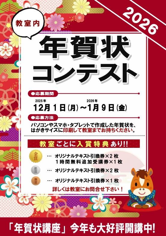 2025年11月08日 10:00 コメント 0 件 教室年賀状コンテストについてみなさま、こんにちは~~。 本日は稲井が担当です、よろしくお願いします。(^^) あれ? 秋はどこ? もう、冬なんですけど~~~。(-_-;) そんな大阪です。 インフルエンザも流行しているみたいですが、みなさん、大丈夫ですか? 朝昼の寒暖差も大きくて、どんな服を着たらいいのかも悩みますよね。 暖かいラーメンが食べたくて仕方がない、今日この頃です。(^_^;) ---------------------------- 冬といえば、、、 そう、年賀状作成の季節です。 門真教室では、毎年、年賀状作成→年賀状コンテスト開催でとても盛り上がる冬ですが、 そこで、とても悲しいお知らせです。 年賀状コンテスト(教室開催)は今年が最後となります。。。 ここ数年、年賀状終いをされるかたも多くなり、 また、作成するとしてもソフトを使うとプロが作った年賀状をそのまま使えたりと、 コンテストの意味がなくなっている???と感じることもあったりで、 今年を最後とさせていただくことになりました。 ただ、「ちゃんと年賀状が作れるかどうか」の確認の意味も込めて、 是非、1枚~2枚を作ってみませんか? 「作り方、忘れちゃった(^_^;)」とならないように、復習の意味も込めて。 ワードで作るもよし、 筆ぐるめで作るもよし。 今年はCanvaで作るという方法もありますね~~。 最後の年賀状コンテストになります!!! ご参加をお待ちしておりますので~~。(*^^*)