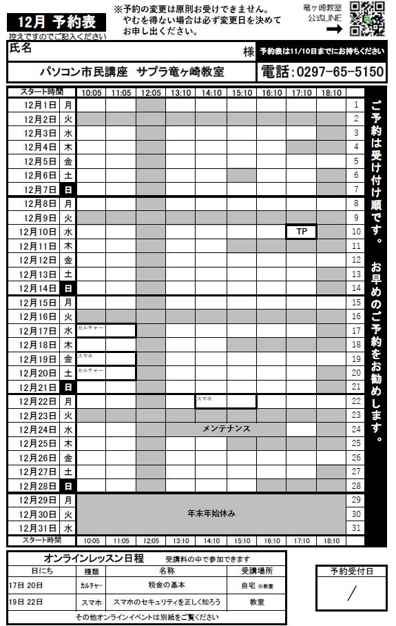 2025年12月01日 10:48 コメント 0 件 ◆12月・1月の予約表◆12月、1月の予約表、1月のオンラインイベントをお知らせいたします。 イベントや追加受講のご予約はお電話でも受け付けております。 LINEの公式アカウントから毎週配信される予約状況も参考に、お問い合わせをお待ちしております。 パソコン市民講座竜ヶ崎教室 0297-65-5150