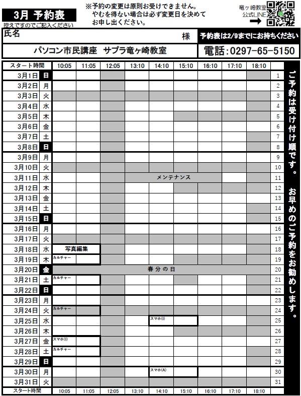 2026年02月01日 09:50 コメント 0 件 ◆2月・3月の予約表◆2月、3月の予約表、3月のオンラインイベントをお知らせいたします。 イベントや追加受講のご予約はお電話でも受け付けております。 LINEの公式アカウントから毎週配信される予約状況も参考に、お問い合わせをお待ちしております。 パソコン市民講座竜ヶ崎教室 0297-65-5150