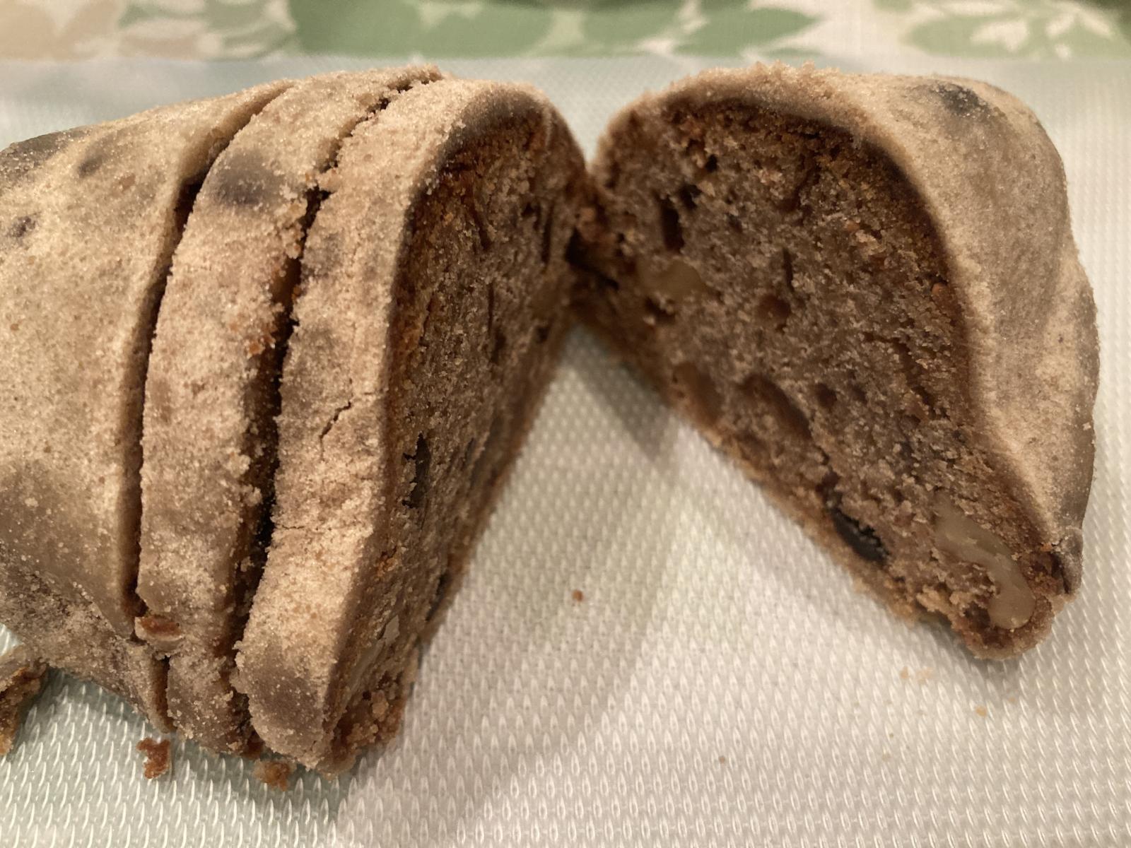 こんばんは。 先日、シュトーレンを買いました(*^-^*) シュトーレンは、 ドイツの伝統的なクリスマスのお菓子で 生地にドライフルーツやナッツなどが練りこまれた ちょっと重めな焼き菓子です(*^^)v 日持ちがするので、 クリスマスイブまでの間に薄くスライスして 少しずつ食べる習慣があるそうです☆ その間、熟成していくので だんだん味が染み込んで美味しくなります。 確かに、1日ずつ、しっとりして 美味しくなってきています(^^♪ できるだけ薄く切っているのですが 果たして、クリスマスイブまでもつかどうか… どうも途中でなくなりそうです(^^;    インストラクター 田中