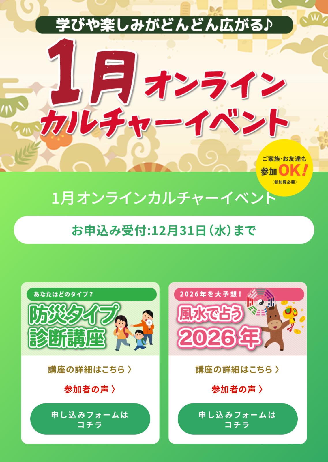 こんばんは 咲ランド教室のブログにようこそ 昨日、 「今年の1月にあった オンラインカルチャー「風水」よかったよ! 来年もないの?」 と聞かれました。 来年の1月にあるのでご案内すると 喜ばれていました。 オンラインカルチャー とても好評です! 12月の「今更聞けない税金の基本」 も大人気で参加人数が 大幅増になったそうです。 1月は 「防災タイプ講座」 「風水で占う講座」 どちらか、 両方でも(^-^) ぜひ参加お待ちしています! 永吉