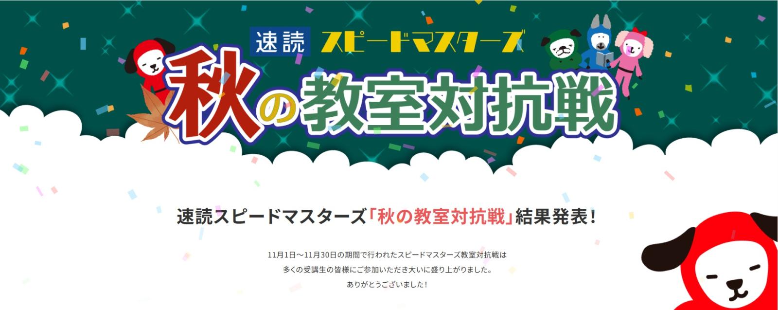 こんばんは 咲ランド教室のブログにようこそ 速読スピードマスターズ 「秋の教室対抗戦」 結果が発表されました。 参加された皆様 ありがとうございました! 咲ランド教室は 団体戦 ログイン回数部門で第3位!! また 個人戦(シニア部門) しゅうこさん  4位 しげるさん   5位 まりこさん  13位 素晴らしい成績です!! おめでとうございます! そしてありがとうございます! さすがですね(*^-^*) 永吉