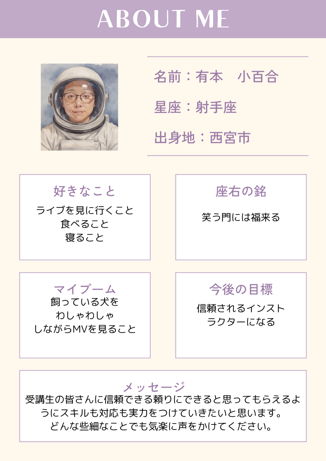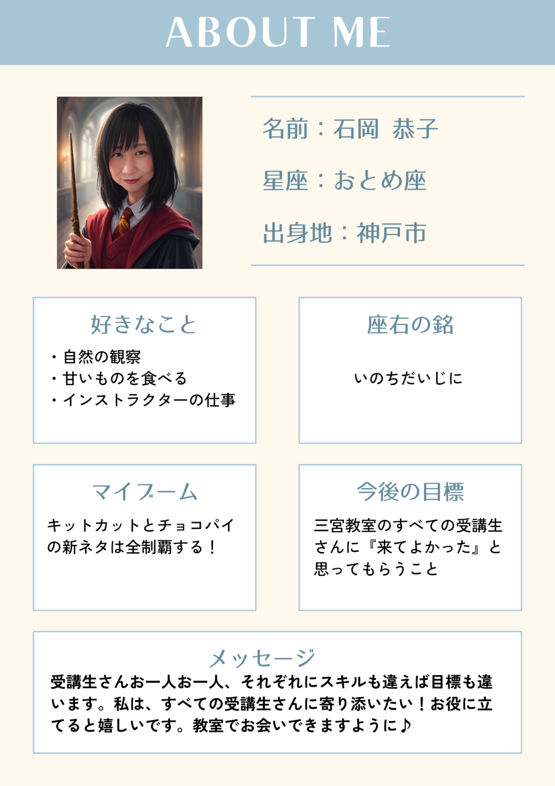2025年09月09日 16:27 コメント 0 件 ★三宮教室インストラクター紹介No.2★こんにちは! 神戸三宮のパソコン教室、パソコン市民講座三宮駅前教室です。 本日はインストラクター自己紹介の第2弾です♪ 最近見慣れないインストラクターがいるなぁ~と思っている方もいらっしゃることと思います。 私、9月1日より正式に三宮教室に配属となりました山際と申します。 市民講座に入社して19年になります。 いつも新しいことにわくわくしています。 まずは三宮教室の受講生の皆様とたくさん会話して、遠慮なくご質問をしていただける関係を築いていけたらと思います。 どうぞよろしくお願いいたします<m(__)m> 本日のブログ担当:山際 ★9月・10月ご予約受付中★ ★9月「Excel活用」イベント★ ★10月 タイピングコンテスト開催!★ ★10月「デジタル活用」イベント★ ★10月 かまた先生の「スマ散歩」開催!★
