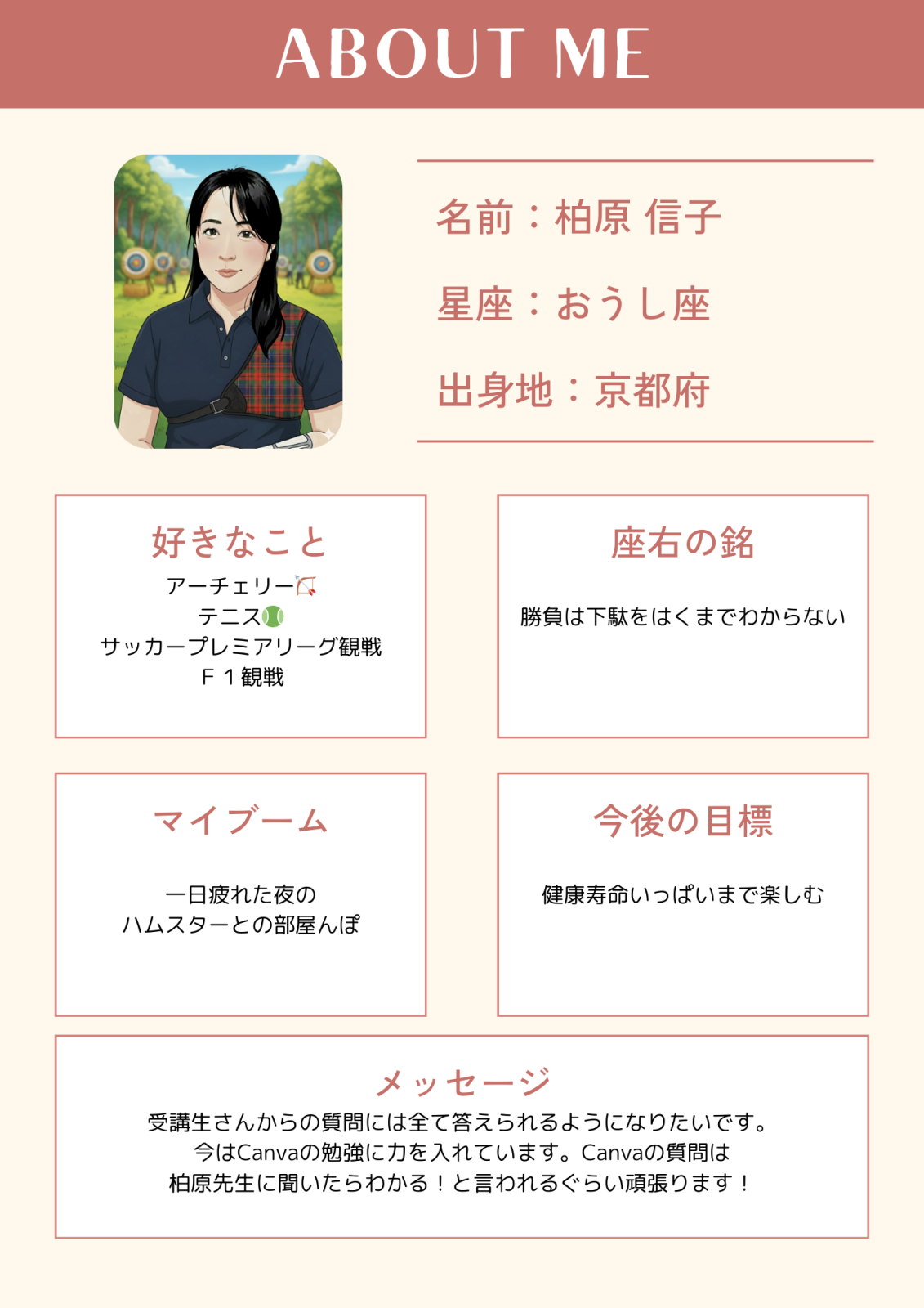 2025年09月16日 10:00 コメント 0 件 ★三宮教室インストラクター紹介No.3★こんにちは! 神戸三宮のパソコン教室、パソコン市民講座三宮駅前教室です。 山際先生に続き、3番目は柏原がお伝えします! インストラクター歴は市民講座で7年、その前に他校で5年となります。 人との新たな出会いが大好きで、新しく入られた受講生さんとは どんな方だろう?どんなことに困ってるんだろう?何か私に お手伝いできないかな?とお話しすることにワクワクしております。 何かお困りのことがあれば、些細なことでもご相談くださいね。 わからないこともあるかもしれませんが、できる限り努力して お応えできる範囲で対応させていただきます。 私生活は4人家族で子供が大きくなったので、私は私!と人生を謳歌しています。 週に2回テニススクールに通い、週に2回アーチェリーをやっております。 試合大好きなので、勝っても負けても挑戦します。 アーチェリーはこの春に試合デビューしましたが、2試合目に優勝しました。 そして昨日、テニススクールの女子ダブルスで準優勝でした。 あと30年ぐらいはテニスもアーチェリーも続けるつもりです。 パソコンもそうですが、「できない」と思った瞬間から人間の体は やらない方に傾いていくと思います。決めつけないで、自分の最大能力を 信じて、何事にもチャレンジすることが大事だと思います! 皆さんのこともたくさん知りたいので、どんどん話しかけてきてくださいね(^0^) 本日のブログ担当:柏原 ★9月・10月ご予約受付中★ ★9月「Excel活用」イベント★ ★10月 タイピングコンテスト開催!★ ★10月「デジタル活用」イベント★ ★10月 かまた先生の「スマ散歩」開催!★ ★かまた先生オンラインスマホイベント毎月開催★