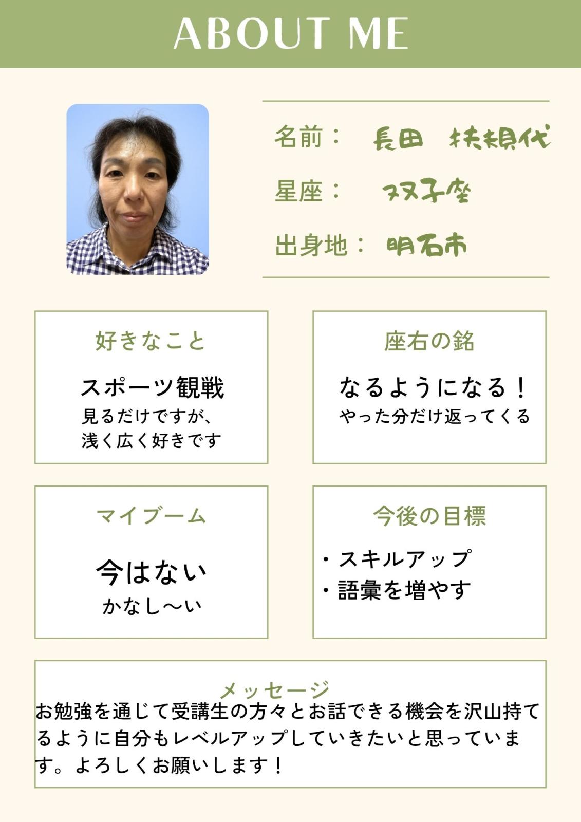 2025年09月22日 15:40 コメント 0 件 ★三宮教室インストラクター紹介No.4★こんにちは! 神戸三宮パソコン教室、パソコン市民講座三宮駅前教室です。 4番目の自己紹介は長田がお伝えします! インストラクターになって2年が経過しましたが、私も受講生の皆さんに交じり勉強中です。 質問される内容も随分分かってきましたが、語彙力が乏しいのかうまく説明できない事もまだあります。 説明で納得していただけることが嬉しいですし楽しいです。やりがいになります。 余談ですが、私はスポーツ全般の観戦が好きで、今年は野球。“阪神優勝”でしょう。世界陸上ももっと見たかったです。こういった雑談もできるといいなぁ。よければ話しかけてくださいね。 自己紹介の写真は証明写真のようになってしまいました。写真は撮るのも写るのもちょっと苦手です。お出かけは好きなのでイベントの素材を見つけたら撮ってみようかな。撮るのが上手な方、是非アドバイスを(笑) 日々、受講生の皆さんとお話ができる事を楽しみにしています。一緒にスキルアップしましょう! 本日のブログ担当:長田 ★9月・10月ご予約受付中★ ★9月「Excel活用」イベント★ ★10月 タイピングコンテスト開催!★ ★10月「デジタル活用」イベント★ ★10月 かまた先生の「スマ散歩」開催!★