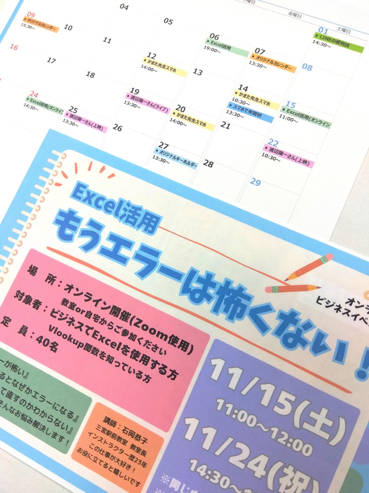 2025年10月02日 10:30 コメント 0 件 ★11月のイベント紹介No.1★こんにちは! 神戸三宮のパソコン教室、パソコン市民講座三宮駅前教室です。 11月の三宮教室は、イベント月間!! ビジネスに役立つものから、生活に役立つもの、楽しいモノづくりイベントまで、各種もりだくさんにご用意しております。 さらに!いつものオンラインカルチャーも、11月はあの戦場カメラマン「渡辺陽一さん」をお迎えしての特別講座となります。 今回は、その中から、わたくし石岡が担当するビジネスイベントをご紹介しますね! 11月は、「Excel活用~もうエラーは怖くない!~」 Excelを使っていると必ず目にするエラーの表示。 いろいろな種類がありますが、日本語で書かれているわけではないので意味が分からないまま困っている方もたくさんいらっしゃると思います。 今回は、よく目にするエラーをいくつかピックアップして、その意味と対処方法を一緒に学びます。 …と書くと、なんだか難しそうに聞こえますが、いつも通りの楽しいイベントです。お気軽にご参加くださいね! 11月6日(木)19:00~(教室にて) 11月15日(土)11:00~(オンライン) 11月24日(祝)14:30~(オンライン) なお、10月のビジネスイベントは「デジタル活用」。 WordやExcelの操作方法だけではなく、パソコンを使っていて便利な裏技あれこれをご紹介します! 日程によっては若干の空きがこざいます。 参加ご希望の方は早めにお申し込みください。 10月7日(火)11:00~(残2席) 10月9日(木)19:00~(残1席) 10月11日(土)11:00~(残1席) お待ちしていま~す! 本日のブログ担当:石岡 ★10月・11月ご予約受付中★ ★10月 タイピングコンテスト開催!★ ★10月「デジタル活用」イベント★ ★10月 かまた先生の「スマ散歩」開催!★ ★11月 イベント下記のとおり★ ・渡辺陽一さん特別講座 ・Excel活用 ・オリジナルカレンダーを作ろう ・LINEの便利技 ・スマホで年賀状 ・オリジナルキーボルダーを作ろう