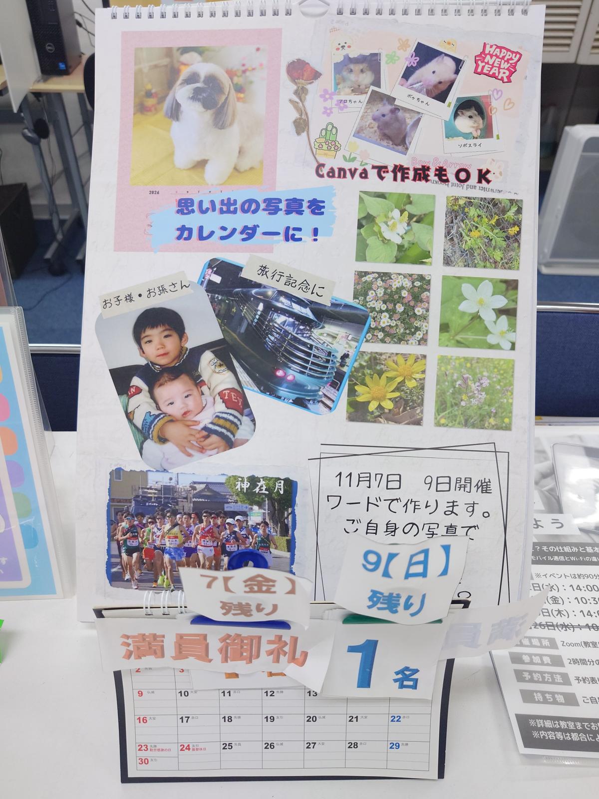 10月に入ったのに、まだまだ暑い日が続きますね💦 さて今週はイベント紹介3回目、柏原がカレンダーイベントのご紹介をします。 毎年大変ご好評をいただいていて、10月15日現在で、11月7日のご予約が満席、 11月9日のご予約が後1席となっておりますので、ご希望の方はお早めにご連絡ください。 カレンダーですが、ワードで作りますので、ワードを使われたことのある方でしたら 簡単に作っていただくことができます。お気に入りのお写真をUSBに入れてお持ちいただき、 写真とカレンダーを入れて、背景の色を付ければ出来上がり。とても簡単に素敵なカレンダーが できます。 また今年からは、教室の受講でCanvaが始まりました。皆さん受講されましたか? Canvaは簡単におしゃれなチラシが作成できるので、事前にCanvaで写真を入れておしゃれな デザインで作成しておけば、カレンダーイベントではそのイラストを入れるだけでOK。 11月からのイベントですが、Canvaを使って作りたい方は、10月から各自でご用意していただければ と思います。教室でイベント準備していただいても大丈夫です。2枚目の写真はCanvaで作成しました。 ちなみにCanvaはチラシだけでなく、動画編集やホームページ作成、ロゴ作成、QRコード作成など いろんなことができるので、興味のある方は受講してみてくださいね。 楽しくなければイベントじゃない!をモットーにしている柏原が全力でお届けします! 残り少ないですが、ご興味のある方は是非ご予約ください! 本日のブログ担当:柏原 ★10月・11月ご予約受付中★ ★10月 タイピングコンテスト開催!★ ★10月「デジタル活用」イベント★ ★10月 かまた先生の「スマ散歩」開催!★ ★11月 イベント下記のとおり★ ・渡辺陽一さん特別講座 ・Excel活用 ・オリジナルカレンダーを作ろう ・LINEの便利技 ・スマホで年賀状 ・オリジナルキーボルダーを作ろう