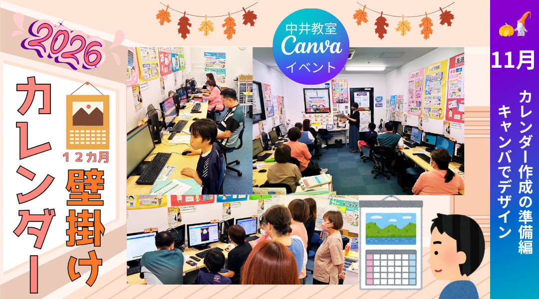 2025年10月21日 15:08 コメント 0 件 カレンダー2026づくりにもCanva!10月になると毎年、早くも いろんなお店で、次の年の 手帳やカレンダーが目に入る! 気になる!ようになりますが みなさんも来年はどんなタイプに しようかな・・なんて思っている この頃ではありませんか? 【世界にひとつだけの オリジナルカレンダーをつくろう!】 毎年11月恒例イベントに先駆け 【Canvaで、ものづくりを楽しもう♪】 10回目のイベント全2回では、11月の カレンダーづくりの準備をしました。 壁掛けタイプ(A3)のカレンダーは Wordでつくるカレンダーですが 今年は、その素材をCanvaで作りました。 今年はじめて体験して頂く \NEWカレンダー/づくりです。 ➀ はじめてのCanva ➁ Canvaデザイン編 ➂ Canvaクリエイティブ編 と、Canva講座もすでに第3弾まで リリースされていますが、 はじめての方も、ぜひこの機会に カレンダーを作りながら【Canva体験】 してみていただきたいと思います。 ================= カレンダーづくりイベント 【日程と予約状況】 11月13日㈭10時・・・残席あと1枠 11月15日㈯13時・・・キャンセル待ち 11月18日㈫15時・・・お席に余裕あり ※ご予約、お急ぎ下さいね!! =================