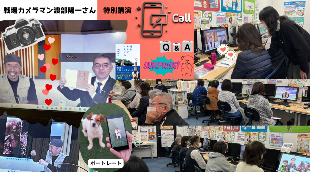 2025年11月19日 18:59 コメント 2 件 戦場カメラマン・渡部陽一 さんの特別講演深まる秋のもと、寒くなった今日は 戦場カメラマン・渡部陽一さんの 【特別講演会】でしたが、 びっくり報告があります!! お話の後、みなさんからの質問に 渡部陽一さんから直接お答えして もらえる時間があったのですが、 \中井教室が参加者が一番多い/ ということで直接教室に電話が入り 教室内は♪驚きのサプライズ状態♪ 2名の生徒さんの質問に渡部陽一さんが 丁寧に真摯にお答えくださいました。 さらに、サイン入り書籍が3名にあたる 抽選会も行われ大盛り上がり。 最後までワクワクが続く、特別な講演 となりました。 「戦争」についてあらめて深く考えてみる そんな貴重な時間を共有しながらも 楽しくあっという間。 渡部陽一さんの言葉と人柄に触れ、 世界を見る目が少し変わる、 そんな貴重なひとときだったのでは ないでしょうか。 スマホ撮影のポイントのお話も 独特なトークが笑いを誘いました♪ おすすめポイントを試してみたいですね! もうすぐかんたんSNSもリリースされる ので活用できそうですネ。 ご参加頂いたみなさん ありがとうございました。 そして、気になる方がいらしたら 今日のライブを映像で見るチャンスが ありますよ!! 11月22日㈯10時~ 11月25日㈫13時30分~ 若干の空きがありますので すぐにお問合せ下さい。 =============