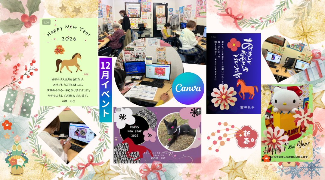 2025年12月07日 11:14 コメント 0 件 動く♪年賀状とクリスマスカードづくり♪こんにちは! 12月らしい寒さになっていますね。 今月の教室イベント 【Canvaでものづくり】11回目は、 写真や好きなイラストに アニメーションをつけて オリジナルの動く!年賀状づくり♪ さらに、音楽までつけて!! 豪華な2026年版が出来上がります。 クリスマスカードにもぴったりです♡ パソコン上で作って、 スマホでダウンロードして LINEで送る手順もわかりますよ~。 そして、11月26日に新しく始まった プレミア倶楽部の”かんたんSNS”に アップするのもチャレンジしてみます。 こんなかんじで、今回も楽しみながら Canvaやプラスアルファでいろいろと ちょっとしたことが学べます。 14日㈰は、満席となっていますが 次の【9日㈫ 10時~】に空きがあります。 来年最初のCanvaイベントは、 1月の予約表でもご案内してますが Canvaでものづくり⑫ ”写真コラージュ”で おしゃれな作品をつくります♪ 映像で学んだだけじゃもったいない 作りながら実践練習することで Canvaをものにしていって下さいネ。 イベント参加で、できるようになる! 1月のご予約、お待ちしています。 ◆日程は全2回◆ ・1月 6日㈫ 10時~ ・1月10日㈯ 13時~ ================