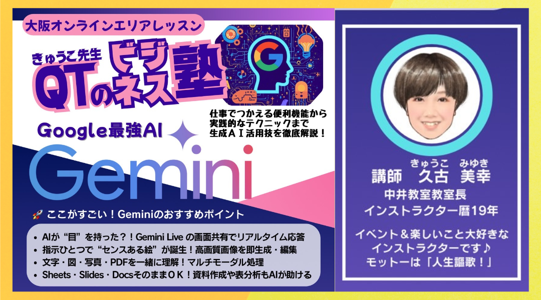 2025年10月19日 09:42 コメント 0 件 【AI活用】役立つモリモリ\QT塾❹/過ごしやすい季節になりましたね。 文化祭や運動会など 楽しい行楽の秋ですが🍁 教室では、人気イベント「QT塾」 全2回が終了したところです。 2カ月に一回のペースで 中井教室の久古先生が担当です。 今回は、名付けて“AI神ツール” Googleの【Notebook LM】のご紹介。 久古先生が今、"イチオシのアプリ”を 熱~く、わかりやす~く、盛り盛りで レクチャーしてくれました!! 聞き逃せない!2時間・・・ みなさんの集中力も半端なく🔥 今回は、『ふるさと納税の資料』を使って 解説しましたが ご自身の資料で早く試してみたい!と 思いながら帰宅されたことと思います。 【Notebook LM】のスゴ~イ‼を 体験したかった・・・ その再チャンスありますよ!! ◎11月9日㈰13時からです。 この時は、オンラインではなく 中井教室で久古先生から 直接学べるのも魅力です💗 \ただいまご予約受付中/ ============= 【次回のQT塾のご案内】 ・12月13日㈯ 10:20~ ・12月21日㈰ 13:30~ GoogleのAIに“目”が搭載👀 『Gemini(ジェミニ)の新活用』 1日100枚!無料で画像生成が可能に! ♪お楽しみに♪ぜひスケジュール調整 してお待ちくださいね。 =============