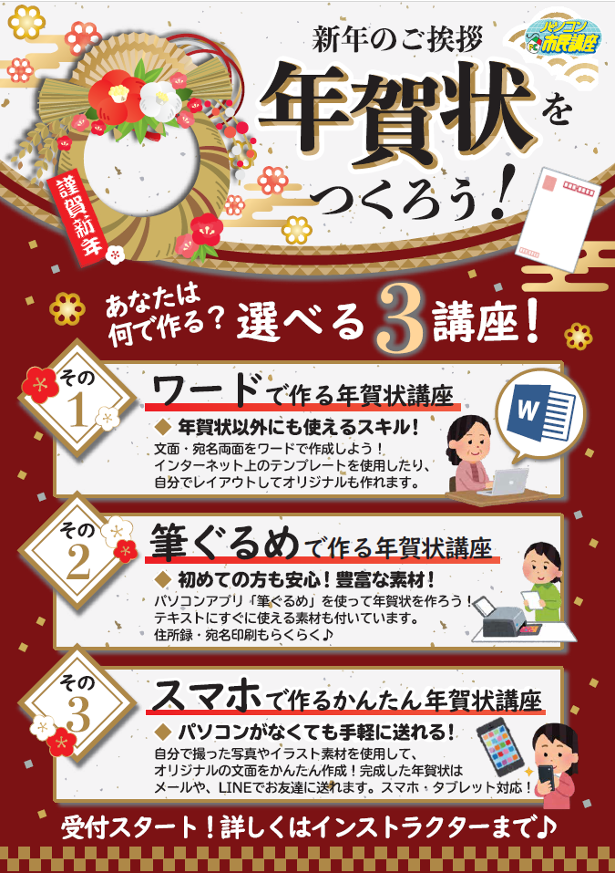 2025年11月11日 09:00 コメント 0 件 ♪教室便り271(年賀状講座スタート)♪\新年のごあいさつを手作りで!年賀状講座受付スタート✨/ 今年も残りわずかとなってきましたね。 そろそろ年賀状の準備を始める時期になりました🎍 毎年大好評の年賀状作成講座が今年も始まります! ✅ 筆ぐるめでつくる年賀状講座 豊富な素材でかんたんキレイ!初心者さんも安心😊 写真入りやイラスト入りなど、 思いが伝わる年賀状がすぐに作れます。 宛名印刷もらくらくサポート! ✅ スマホでつくるかんたん年賀状講座 パソコンがなくてもOK!スマホだけで完結📱 写真やイラストを使って文面を作り、 できあがった年賀状はメールやLINEで送信できます! スマホ・タブレット対応です✨ ✅ Wordでつくる年賀状講座 Wordを使って文面も宛名面も作成! テンプレートを使ったり、自分でレイアウトして オリジナルのデザインにも挑戦できます✨ 年賀状以外の作品づくりにも役立つスキルが身につきます♪ 🎉 そして今年も開催!年賀状コンテスト 🎉 あなたの作品で、ぜひ入賞を目指してみませんか? 教室がしっかりお手伝いします! 大切な人を思いながら作る年賀状は、 心がこもった特別な贈り物です。 今年一年の感謝を込めて、気持ちを届けましょう😊 詳しくはインストラクターまで♪ お気軽にお問い合わせください🌟