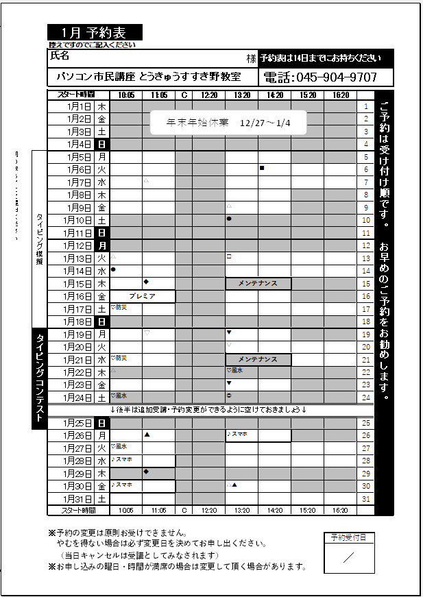 2025年12月02日 08:01 コメント 0 件 ♪教室便り274(1月イベント編)皆さんこんにちは🎅 パソコン市民講座とうきゅうすすき野教室です🎄 12月に入り、街のイルミネーションが一段ときらめく季節になりましたね❄️✨ 今年も残りわずかとなり、慌ただしさのなかにも一年を振り返る場面が増えてきました。 教室では 1月の予約表 の受付をスタートしました📅 年明けは新しい気持ちで学びを始める方が多く、毎年人気の時間帯は埋まりやすくなっています。 ご希望の日時がある方は、ぜひお早めにご確認くださいね。 1月のイベントは・・・・🎉 【かんたんSNS ★ つかいこなしレッスン】 ・日 時:1月16日(金)10:05~12:05 ・参加費:1時間分の受講料 11月にリリースされたプレミアサイトの 「かんたんSNS」 を、わかりやすくご紹介! 「どうやって投稿するの?」「フォローするには?」など、知りたかった情報が盛りだくさん。 実際に写真を投稿したり、コメントをやり取りしたりしながら体験していただきます。 旅先の風景や趣味の作品を紹介したり、面白い投稿にコメントして交流したり―― 毎日の生活がちょっと楽しく、豊かになるかもしれません。 皆さんも、新しい「つながり」をはじめてみませんか? ★タイピングコンテスト★ ・-・-・-・-・-・-・-・-・-・-・ 模擬 1月5日(月)~18日(日) 本番 1月19日(月)~25日(日) ・-・-・-・-・-・-・-・-・-・-・-・ 期間中、何度でも挑戦していただけます。 挑戦するたびに記録が伸びていくのを実感できますので、ぜひ何度もトライして、自己ベストを目指してみてくださいね! 教室イベントの他、オンラインでも多彩なイベントを企画していますのでぜひご参加ください。 詳しくは教室インストラクターまでお声かけください。 寒い日が続きますが、どうぞあたたかくしてお過ごしください☕ 皆さまのご来校を心よりお待ちしています。