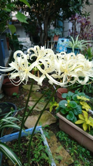 白いのは、彼岸花と鍾馗水仙(ショウキスイセン)が交配したものだそうです。