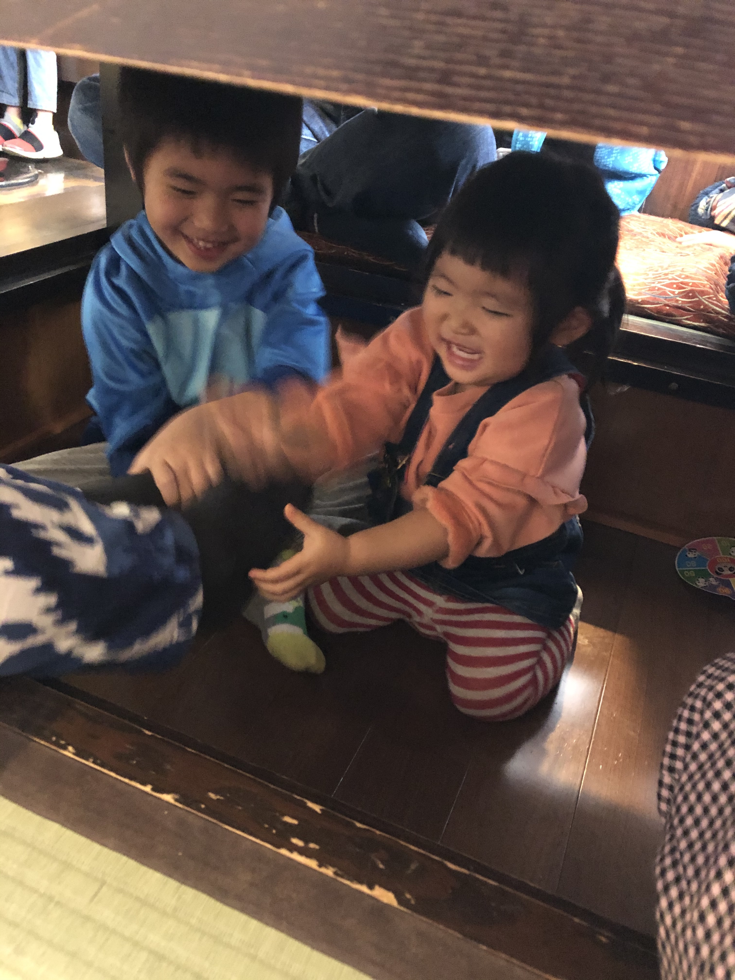 テーブルの下が掘りごたつ式だったので、潜ったり~