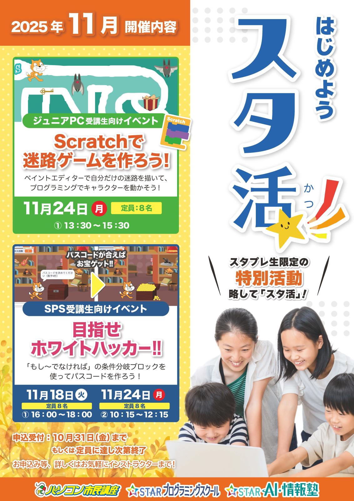 ●参加費:ジュニアPCチケット2時間分、または追加チケット2時間分、または単発受講料2時間分(4,180円)