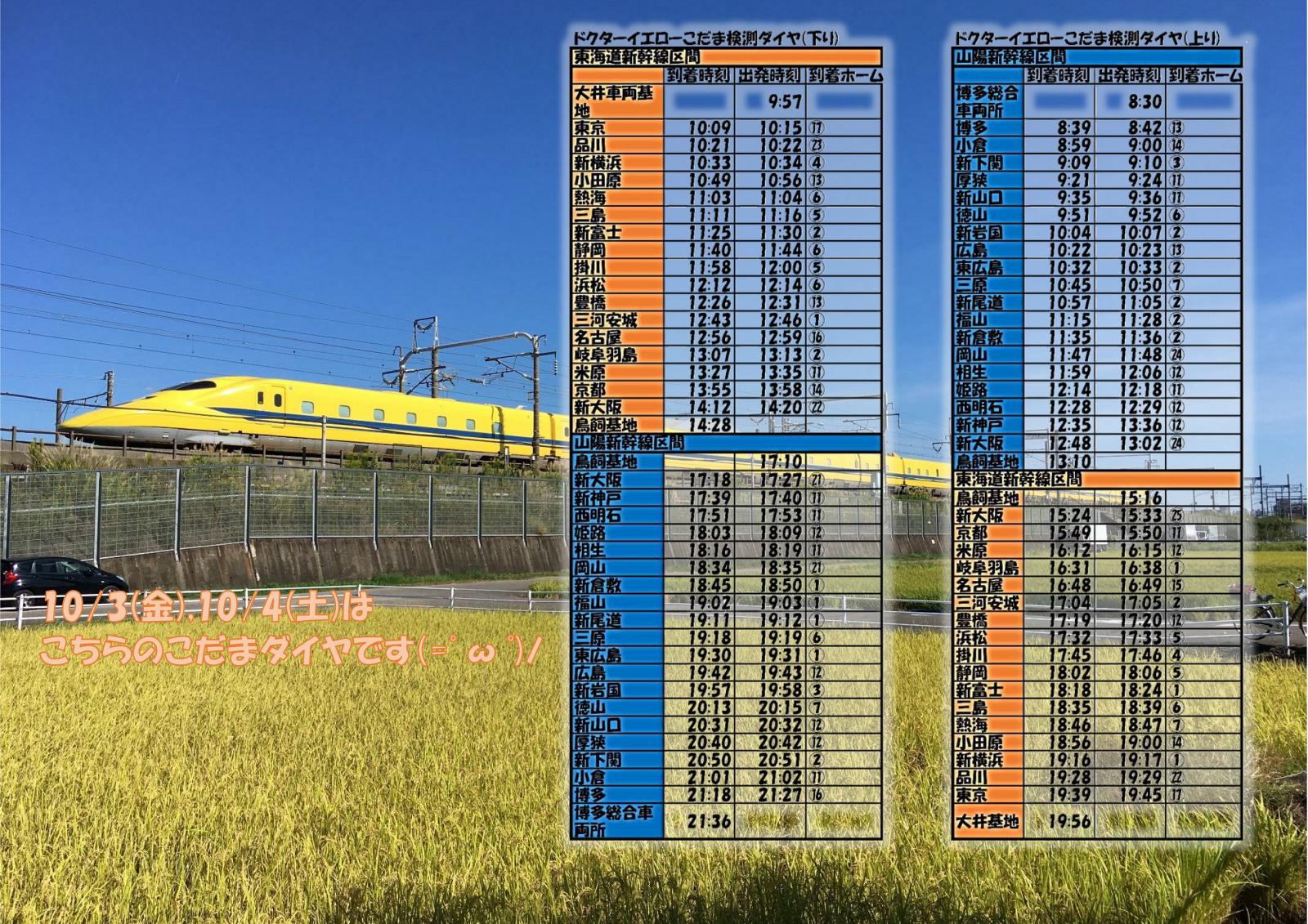 それでは次回のドクターイエロー運行予想日は10/3(金),10/4(土)でこだま検測でございます(=゚ω゚)ノ