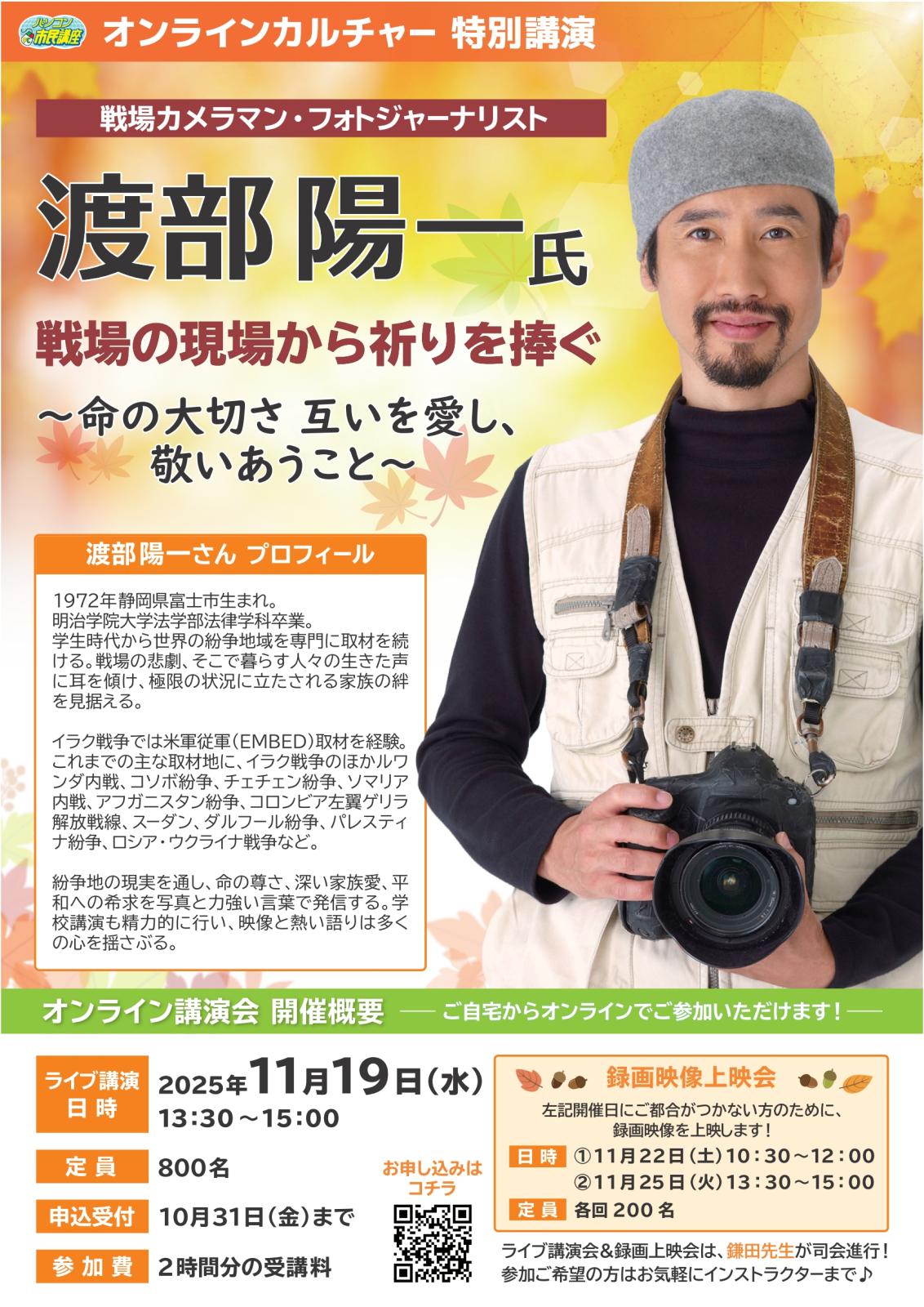 11月のオンラインカルチャー特別講演は【渡部陽一さん】に講演していただきます。