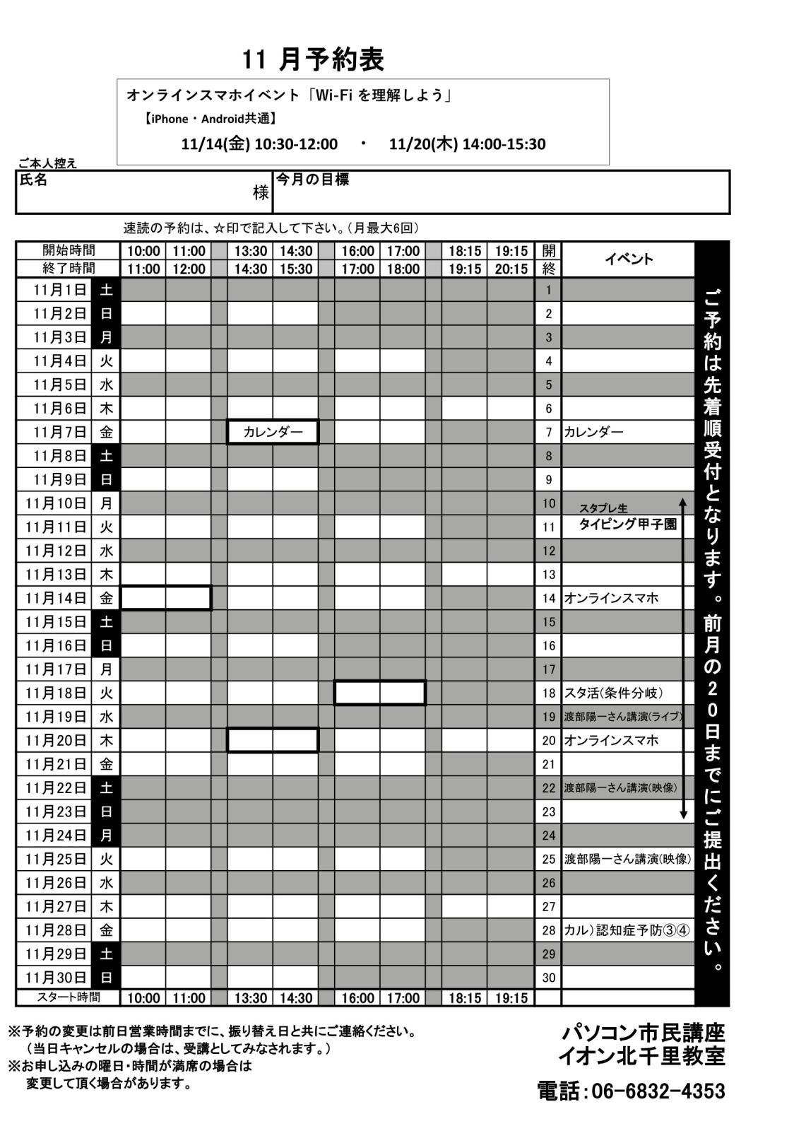 イオン北千里教室から今週の予約状況と11月予約受付開始のご案内です。