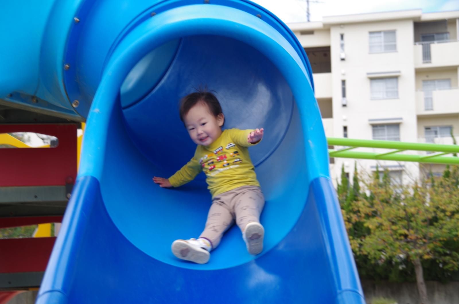 3枚目:滑り台を滑って、静電気で髪の毛が逆立っている息子氏
