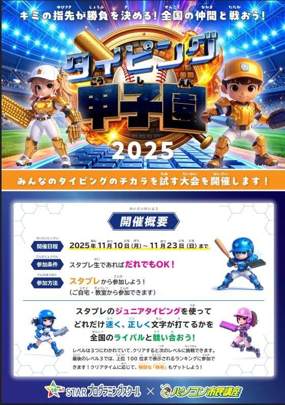 さて、今回はスタプレ生へのご案内になりますが、11月10日より、「タイピング甲子園2025園」が開催されます。