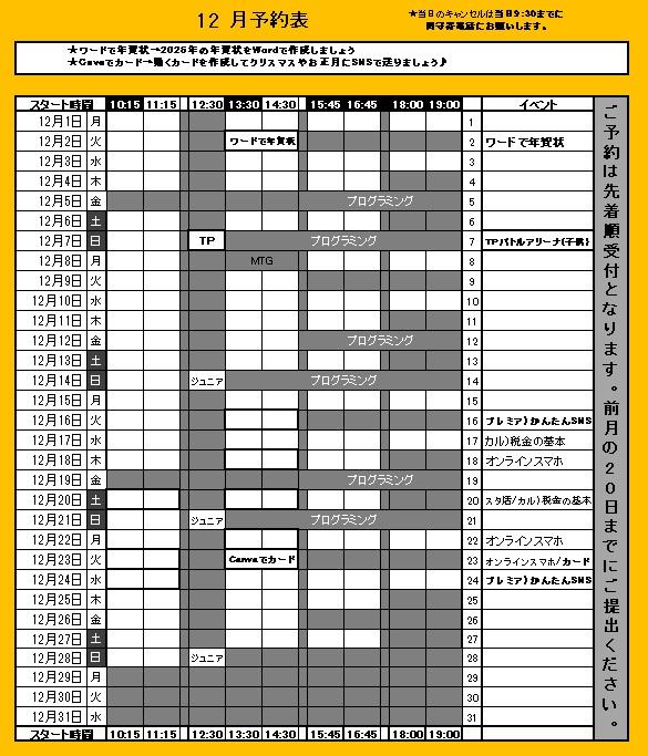 教室では12月予約表をお渡ししています。